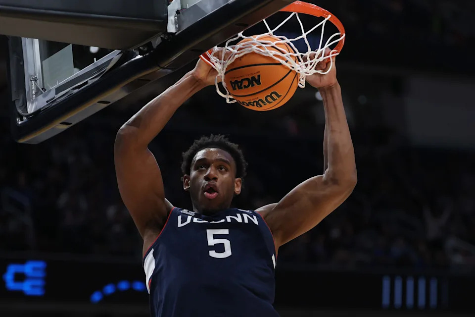 Tarris Reed Jr. #5 of the UConn Huskies dunks against the Duke Blue Devils during the second half of a game in the Elite Eight of the 2026 NCAA Men’s Basketball Tournament at Capital One Arena on March 29, 2026 in Washington, DC.