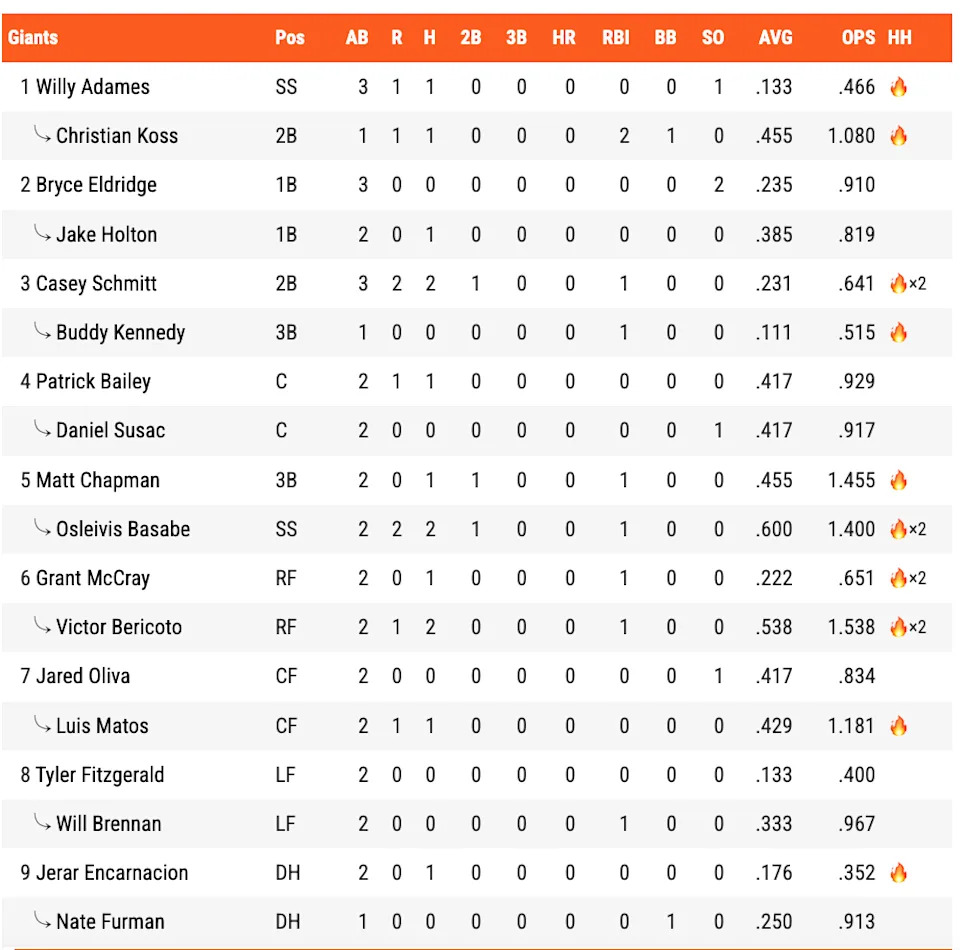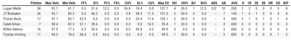 Casey Schmitt went 2-for-3 with a double, an RBI, and a 105 MPH lineout to center. Matt Chapman and his infield replacement, Oslevis Basabe, both doubled, and Basabe also singled an eye-fastball fastball in the 8th.