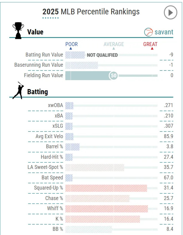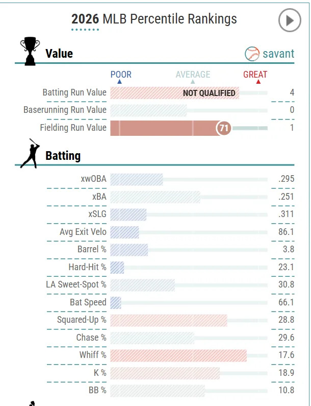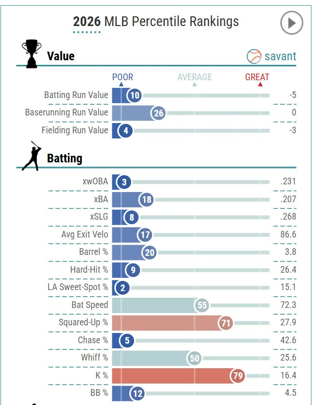 If we compare Vazquez’ 2025 (.189/.271/.274) to his current 2026 (.375/.444/.688) via the metrics, here is what we get: