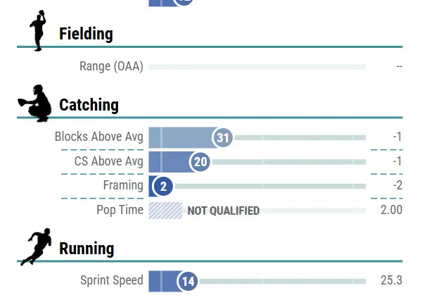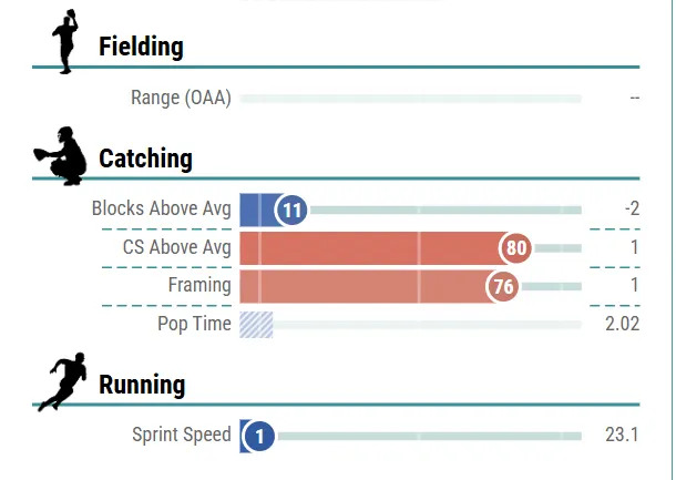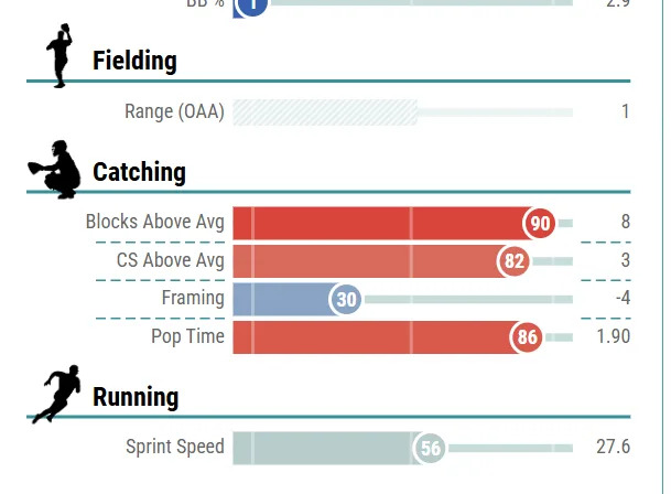 Framing could also be a factor of limited opportunity. Sprint speed is down, and that is to be expected in an aging catcher.