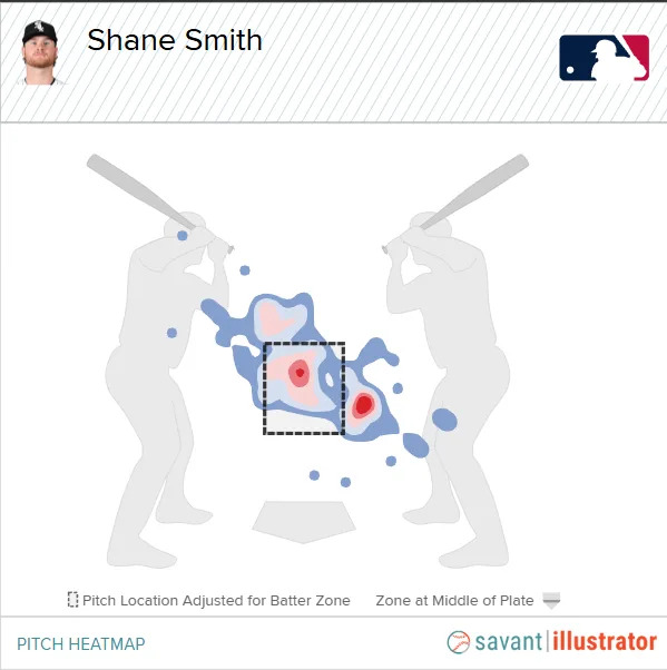 The issues are easy to diagnose. Smith has completely lost the ability to spot his fastball. Compare his 2025 heat map to 2026: